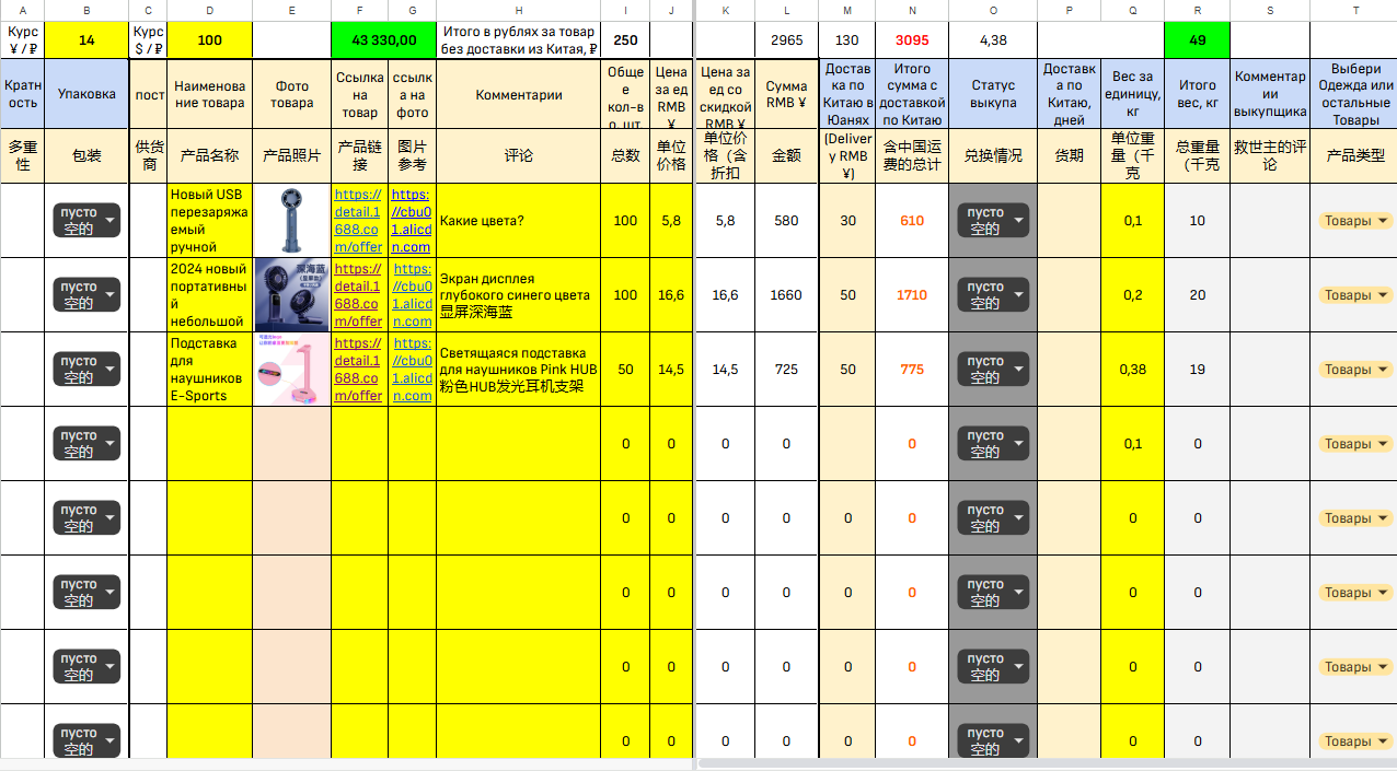 Заполните Наименование товара, Ссылку на фото, Ссылку на товар, Комментарии к товару, Цену за товар в юанях, Вес в кг одной единицы.