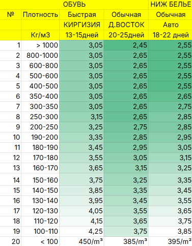 Пример расчета плотности: Плотность всех упакованных товаров = Вес (кг) / Объем (м3) = 200 кг / 1,275 м3 = 156 плотность