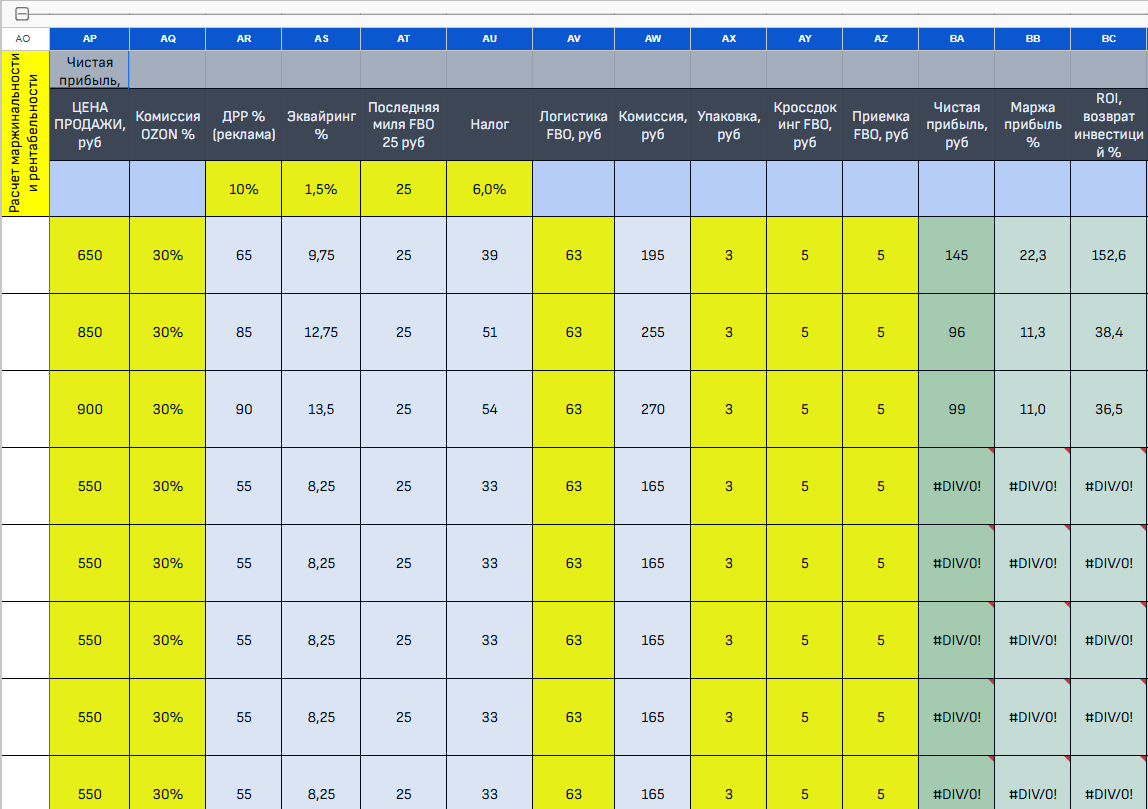 цену продажи, комиссию, ДРР, эквайринг, логистику, налоги и другие расходы.
