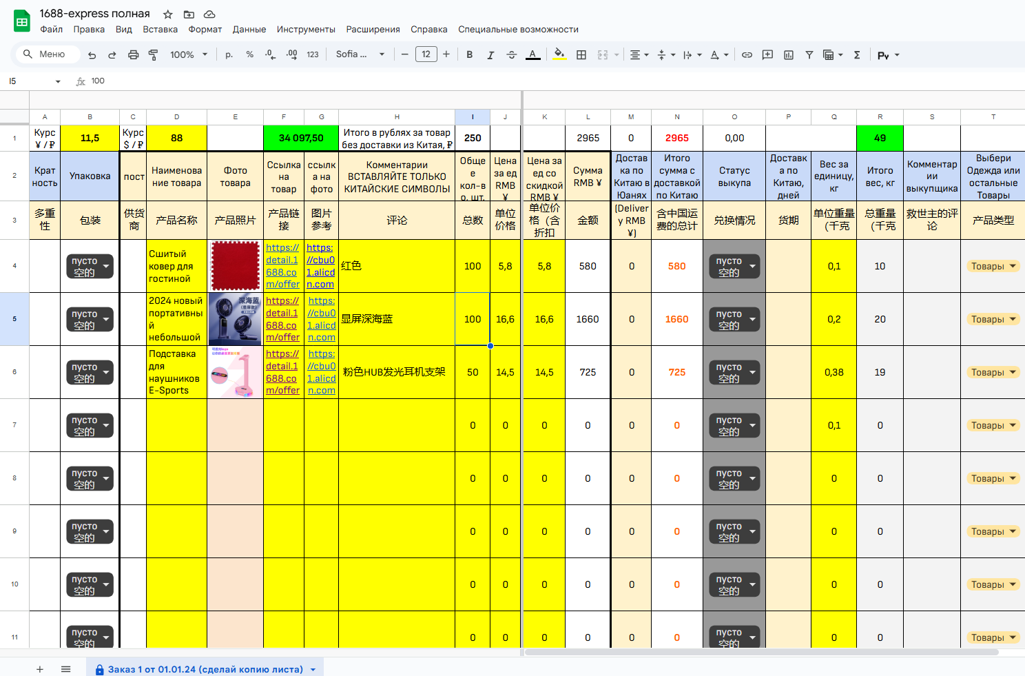 Чтобы рассчитать себестоимость или оформить заказ с 1688, достаточно заполнить жёлтые столбцы: •